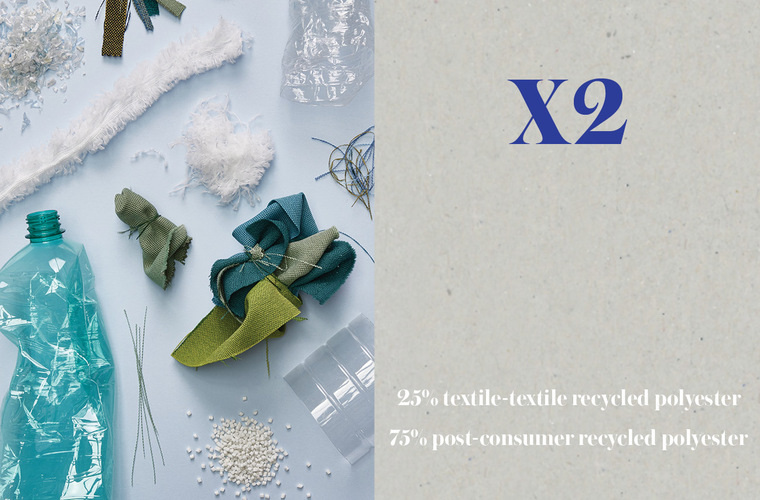The fabric includes 25% textile waste blended with 75% post-consumer recycled polyester from plastic bottles.