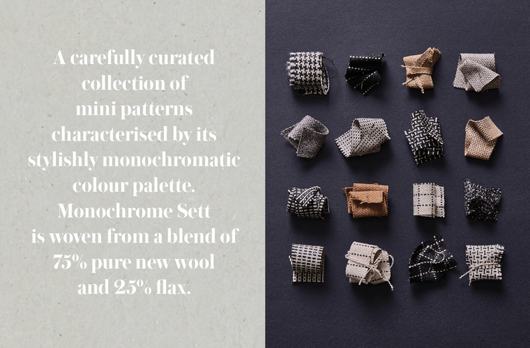 A carefully curated collection of mini patterns, Monochrome Sett is characterised by its stylish monochromatic colour palette, which is colour woven from a blend of pure new wool and flax.